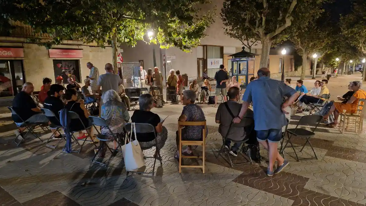 Quan passaven pocs minuts de dos quarts de nou, ja vam veure baixar la Dolors Bombardó, que es portava la cadira de casa (tal com deia el cartell) i, de mica en mica van anar arribant els garlaires. Mira, en Plàcid Busquets, i després en Jordi Llenas i ara les germanes Font i en Babalua i els de ca la Emília i aquests qui són, que no els conec. Arribava gent de totes bandes. A tres quarts de nou ja érem una trentena i a les nou en punt, oficialitzàvem el tret d’inici de les 24 hores de tertúlia, donant la benvinguda a la rotllana, que ja feia patxoca.