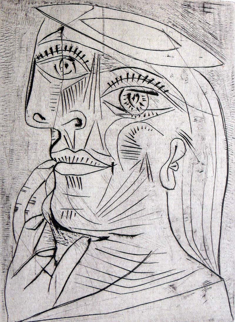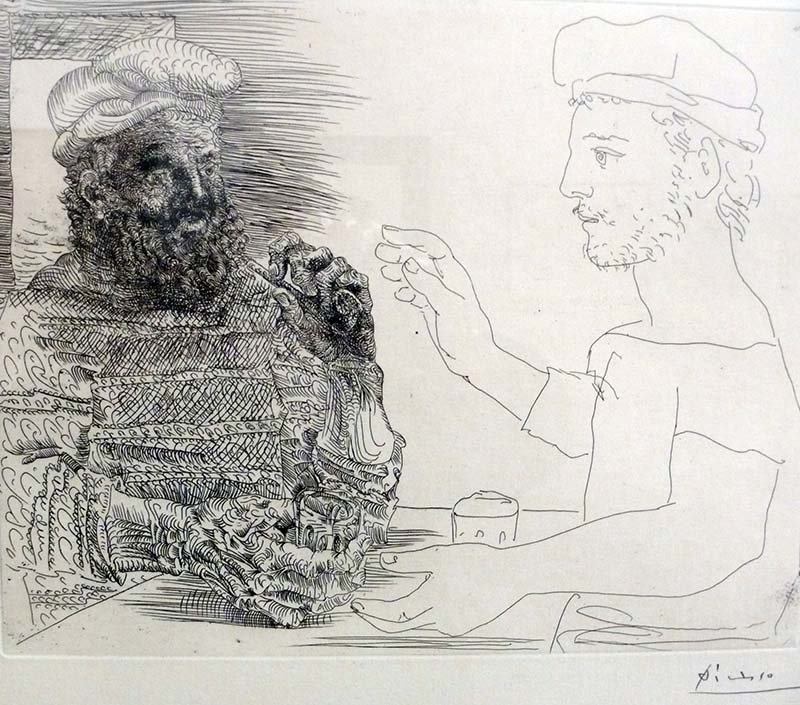 En la primera d’aquestes exposicions hi trobem el Picasso més atrevit i informal, el qual, fent gala del seu domini del dibuix, ens mostra les perspectives eròtiques, burlesques o escandaloses d’uns personatges de ficció que s’encadellen amb la figura del pintor. Són dibuixos sobre gravat, amb tècniques d’aiguafort, aiguatinta, punta seca, al sucre i litografies, en els que el traç crea les formes d’una manera rotunda i lliure (Figs.1 i 2).