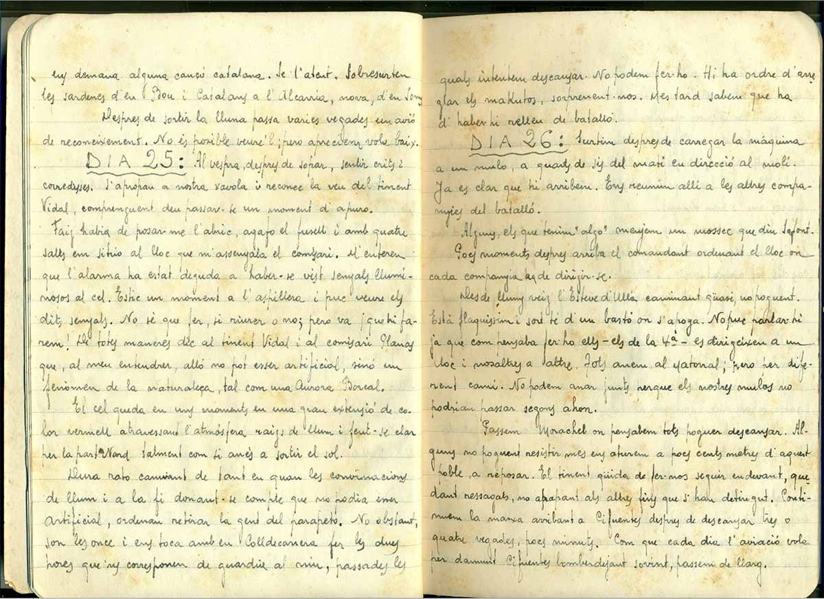 Dia 25. Al vespre, després de sopar, sentim crits i corredisses. S’apropen a la nostra xavola i reconec la veu del tinent Vidal, comprenc que deu passar un moment d’apuro. M’afanyo a posar-me l’abric, agafo el fusell i en quatre salts em situo al lloc que m’assenyala el comissari. M’enteren que l’alarma ha estat deguda a haver-se vist senyals lluminosos al cel. Estic un moment a l’espitllera i puc veure els dits senyals. No sé què fer, si riure o no, però va ¡què hi farem! De totes maneres dic al tinent Vidal i al comissari Planas que allò, al meu entendre, no pot ser artificial, sinó un fenomen de la naturalesa, tal com una Aurora Boreal.