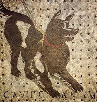 Cave Canem, està escrit i representat en un mosaic situat al vestíbul d’una antiga casa romana que es troba a Pompeya. Representa un gos encadenat i traduït seria “vigileu amb el gos” o “gos perillós”, una frase que encara es pot trobar en algunes façanes de cases. La vivenda on hi ha aquest mosaic, és anomenada “la casa del poeta tràgic” per la seva preciosa decoració.
