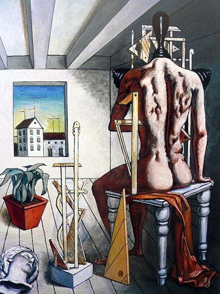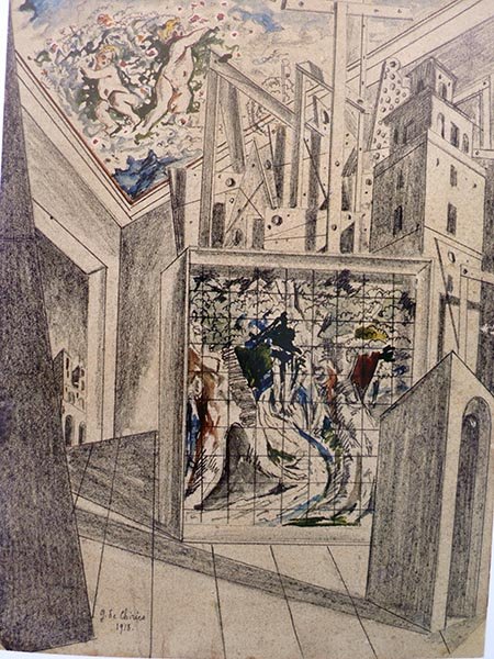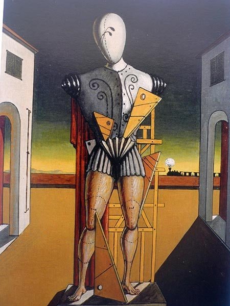 En la seva concepció de l’art es mostra la tensió entre aquest món arcàdic ple de mites i de valors estètics que ell vol preservar i l’aparició d’una nova societat dominada per la màquina i la tècnica que la deshumanitza. És un pintor avantguardista que menysprea les avantguardes, des de l’impressionisme fins a l’expressionisme, des del cubisme fins a l’art abstracte. Defensa els coneixements pictòrics dels clàssics i està influenciat per la pintura postromàntica i simbolista de pintors com el suís Böcklin i l’alemany Max Klinger (1), que va poder conèixer durant la seva joventut, en l’etapa de formació acadèmica a Munic. També podem rastrejar la influència del corrent ideològic de la Neue Sachlichkeit (Nova Objectivitat), que desvirtua l’humanisme clàssic i introdueix nous elements en el pensament i en l’imaginari de De Chirico. Aquests el porten cap a altres vessants de foscor psíquica i espiritual en la seva pintura, com són la “melancolia” -que també apareix unida a la pintura del “maquinisme” en altres autors centreeuropeus dels anys vint-, i l’“enigma”, aspectes als quals De Chirico tant s’hi