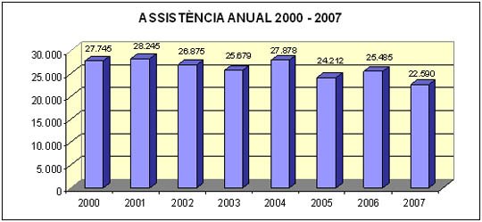 L’assistència al cinema de Torroella, aquest any passat 2007, ha disminuït en 2.897 espectadors (-12,82 %) i en un 18,58 % respecte a l’any 2000 (5.155 espectadors menys).
