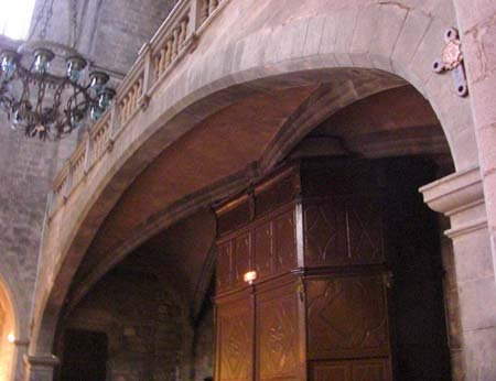 L’arcada del cor és molt agosarada, té tota l’amplada de la nau del temple, 13,48 m, i sostenen el pis quatre arcades que neixen a les bases dels campanars i es tanquen amb una clau de volta.