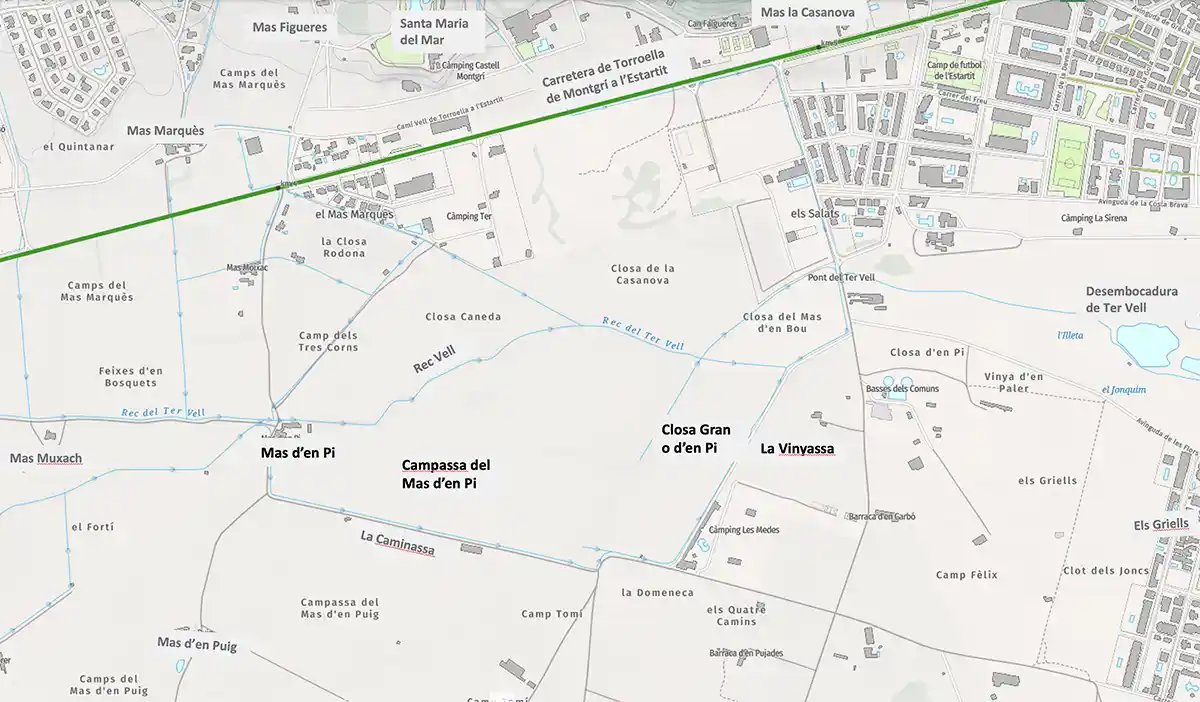 El Mas d’en Pi està situat a la vora del Rec Vell, a la cruïlla entre el Camí de Baix o de Mar i el del Mas la Barraca, dins el terme municipal de Torroella de Montgrí. És el resultat d’un procés que dura uns pocs centenars d’anys que permet posar en conreu els terrenys al·luvials situats a la zona antigament denominada Grahells (Griells), que delimiten al sud amb la Caminassa, a l’est amb el darrer alvèol de l’antiga llera del Riu Ter i al nord amb l’esmentat Rec Vell i el que fou la Closa Caneda.