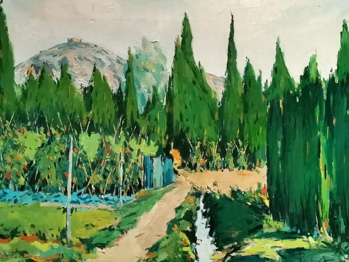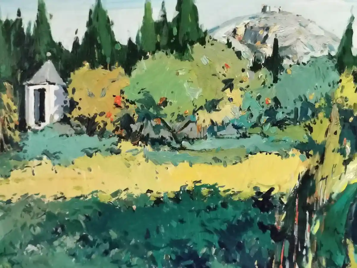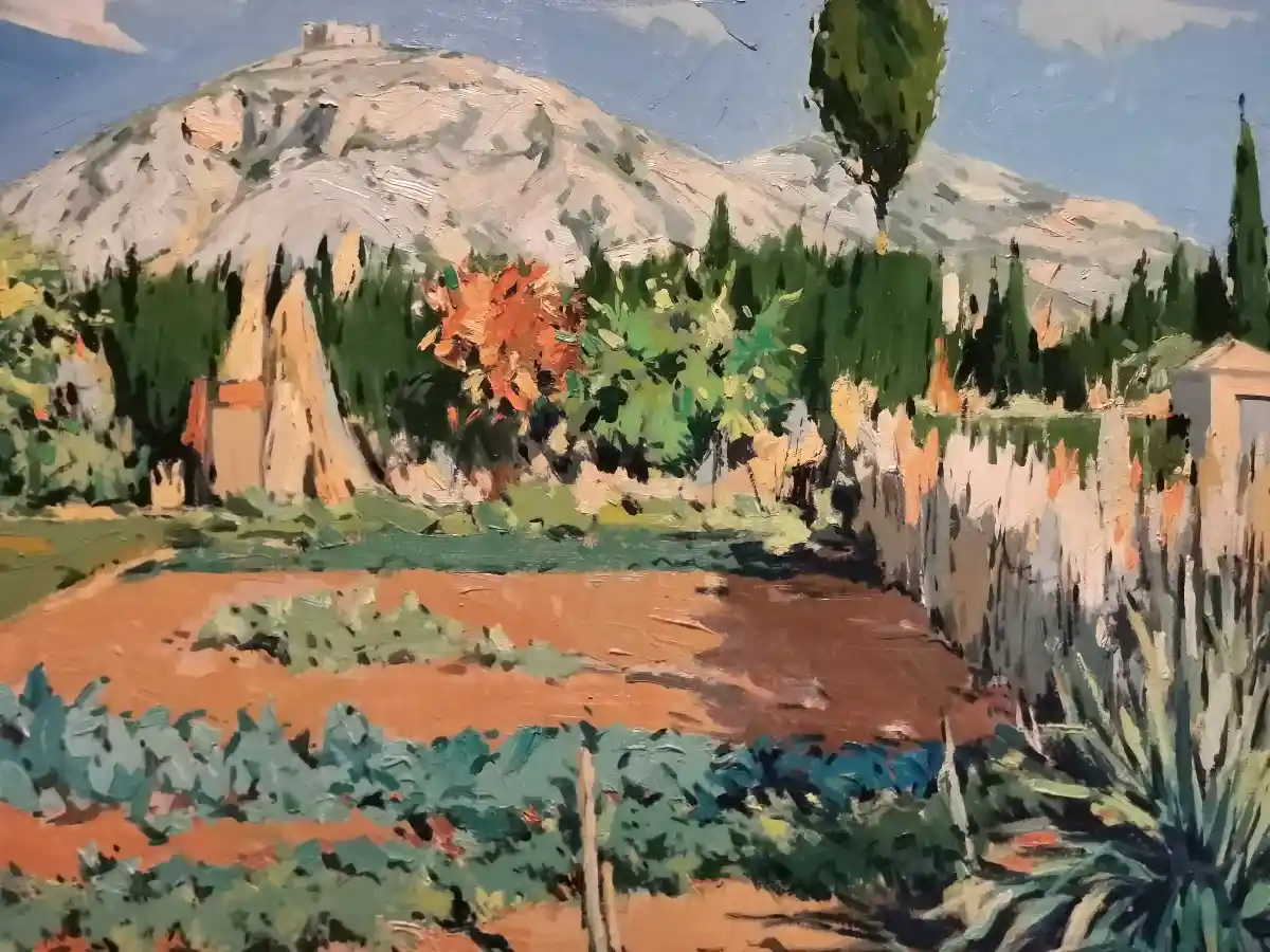 Veig en els quadres que contemplo unes figures de límits imprecisos, de manca de detallisme i de colors aproximats als reals, encara que no ben bé els que té el Montgrí. A la vegada, a més de la muntanya, els components més reiterats en cada obra exposada són el castell, l’ermita, la vegetació, els horts, els camins i el cel. I tots ells amb uns colors molt vius de pintura a l’oli transportats a la tela i al cartró amb pinzellades enèrgiques ben denses. La matèria pictòrica és l’altra protagonista juntament amb el color.