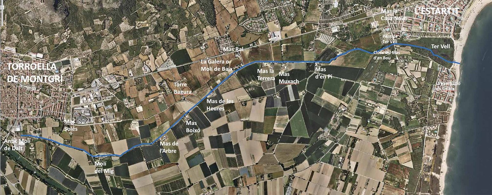 El Molí del Mig conserva alguns elements de l’antic molí, entre els que destaquen la bassa, les restes del carcabà i els escuts dels Pons i dels comtes de Solterra. Aquests el vengueren al militar retirat Ramon Boy Deulofeu, el 1877. Més recentment, els actuals propietaris l’han reconvertit en l’Hotel Molí del Mig. Per altra banda, el Molí de Baix, conegut també com Mas la Galera, fou un antic molí draper de batans. Possiblement el seu aspecte actual és fruit d’una remodelació més recent, quan ja no funcionava com a molí i la propietat l’havia adquirit la família Robert. El darrer mas que es troba en el recorregut del Rec Vell és el Mas la Casa Nova, a l’entrada de l’Estartit. El seu nom antic era la Casa Nova del comte de Solterra, fet que indica que es va construir en èpoques més recents que els molins. Quan es ven, l’any 1870, l’adquireix Josep Serrallés Marquès, un indià originari de Begur. Actualment, moltes de les seves terres estan urbanitzades o acullen diversos establiments turístics.