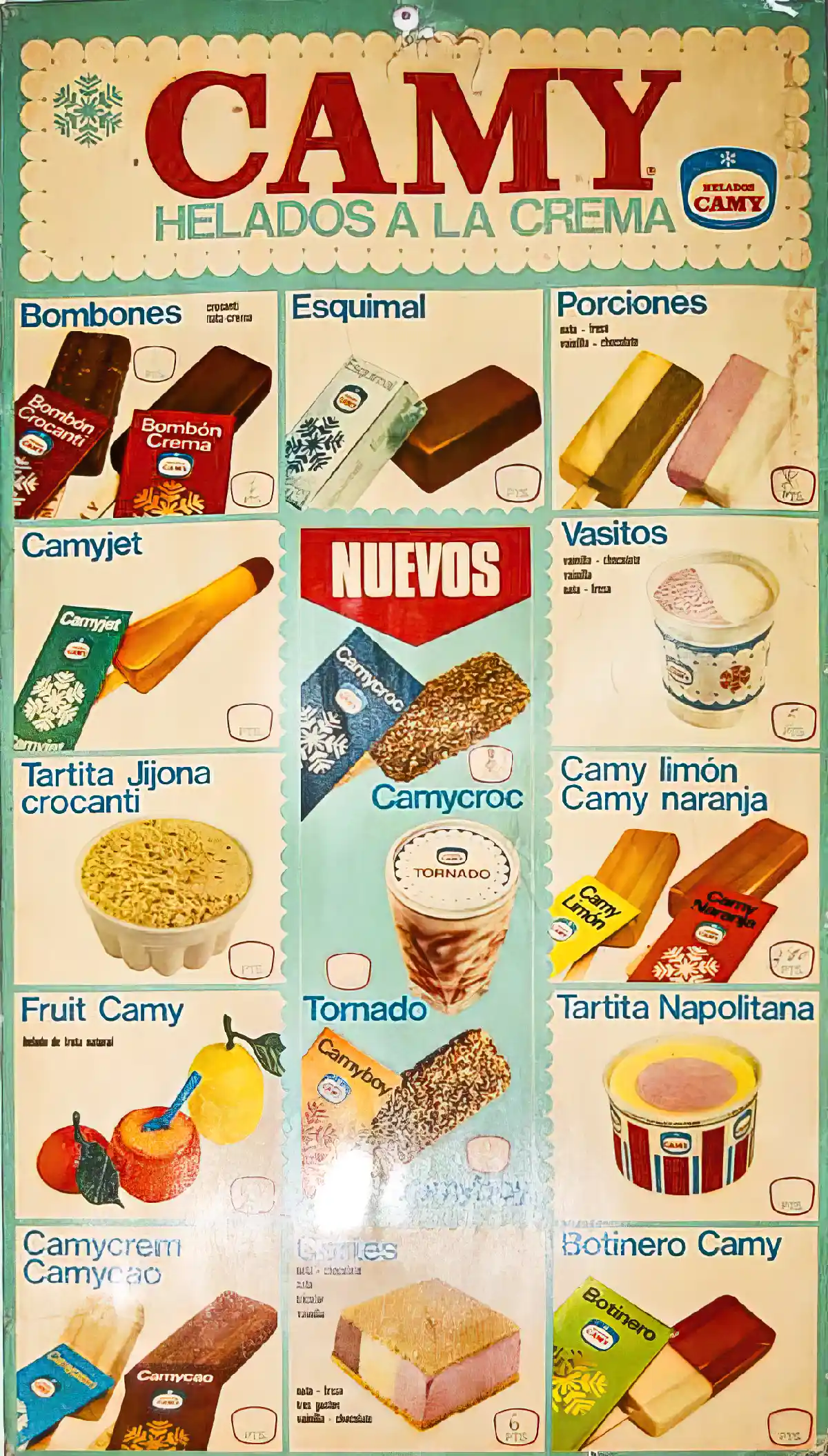 Dues caixes de polo de taronja, dues més de llimona, una d’aquell gelat en forma de coet de tres gustos i banyat de xocolata a la part superior (ah! Sí, el “CamyJet”!), dues d’”almendrado”, una de “vasitos” de vainilla i xocolata i quatre barres de “corte”. “El de tres gustos, nen, que és el que es ven més!”. I en alguns llocs on despatxaven molts gelats de postres, com l’enyorat restaurant KonTiki, quatre o cinc pots de cinc litres, també de vainilla i xocolata, no hi havia més opcions possibles en aquells temps. Encara no es venien els cucurutxos tipus “Corneto”, tant populars anys més tard.