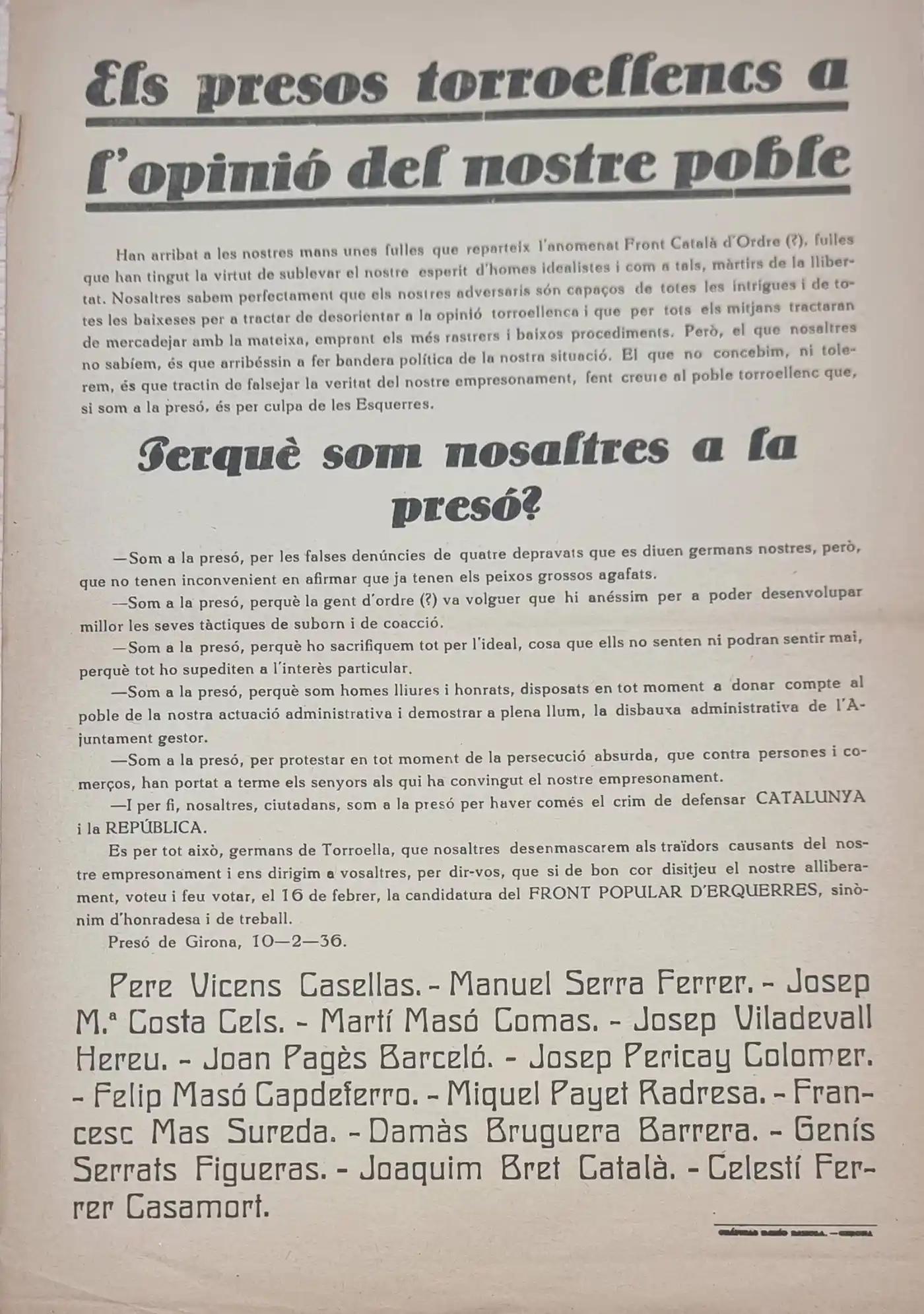Manifest presos torroellencs. 10-02-1936. Es publica un manifest dels presos torroellencs responent a la pregunta Per què som nosaltres a la presó? I les respostes són, per : -Les falses denúncies de quatre depravats … – Perquè la gent d’ordre (?) va volguer que hi anéssim … – Perquè ho sacrifiquem tot per l’ideal … – Perquè som homes lliures i honrats … – Per protestar en tot moment de la persecució absurda …. – I som a la presó per haver comès el crim de defensar CATALUNYA i la REPÚBLICA. Acaba demanant el vot per la candidatura del Front Popular d’Esquerres a les properes eleccions. Signen els catorze presos torroellencs.