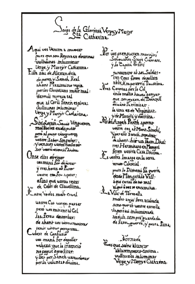 Els primers goigs sembla ser que podrien ser obra d’Andreu Sàbat, escrits entre el1655 i el 1670. Consten de 10 estrofes de vuit versos, menys la primera i darrera de quatre. I tenen com a rescobla els següents : «vullaunos inluminar / Verge y Martyr Catharina./». Porten com títol Goig de la Gloriosa Verge y Martyr Sta. Catharina. A les dues primeres estrofes es fa una presentació de la santa, de la seva intel·ligència i habilitats retòriques. «Filla sou d’Alexandria /…../ Sinquanta savis vingueren / molt doctes en disputar / però al punt conegueren / vostre Saber Singular». Les estrofes tercera, quarta i cinquena expliquen el martiri de la santa i la sisena el martiri que van patir els seus seguidors. «vVostre cos feu açotar: / afins que vareu restar / de color de Clavellina //. /Entre rodes molt cruel / vostre Cos varen passar //. // vos maná degollar / … / y llet per Sanch vareu donar//. Sinquanta Savis Cremats / … / tres cents (soldats) foren degollats / ab la Emperatris Faustina//. A la setena estrofa ens parla de les tres virtuts principals de la santa : «la una es de Virginitat, / y de Martyri, y doctrina.// A les tres darreres estrofes s’expliquen fets històrics i el vincle de l’ermita i la vall amb la vila de Torroella: «Tres hermitans en Mongri / feren vostra Casa Divina //. Des de Mongri á la Vall: / a qui curau de tot mal / al que â vos se encamina. // La vila de Torroella / … / aveula sempre guardada / de fam, guerra, y pesta fina //.