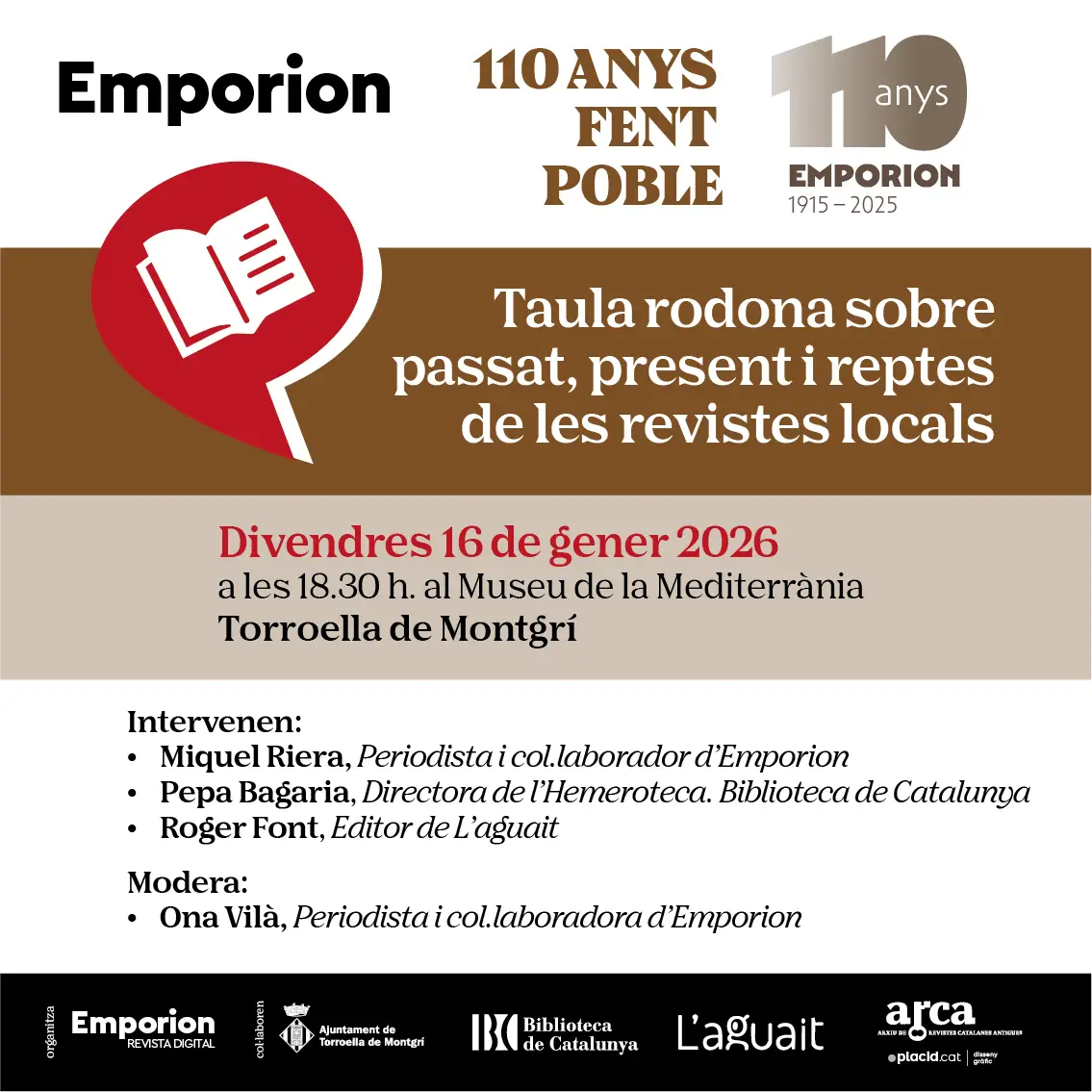 La revista Emporion arriba a una fita històrica: 110 anys fent poble (1915–2025). Tot i que el 110è aniversari es va complir oficialment l’any passat, motius d’agenda han fet que l’acte central de celebració s’hagi programat a l’inici d’aquest 2026, un any especialment significatiu, ja que coincideix també amb el vintè aniversari de la tercera època de la revista (2006–2026).