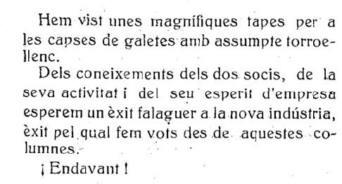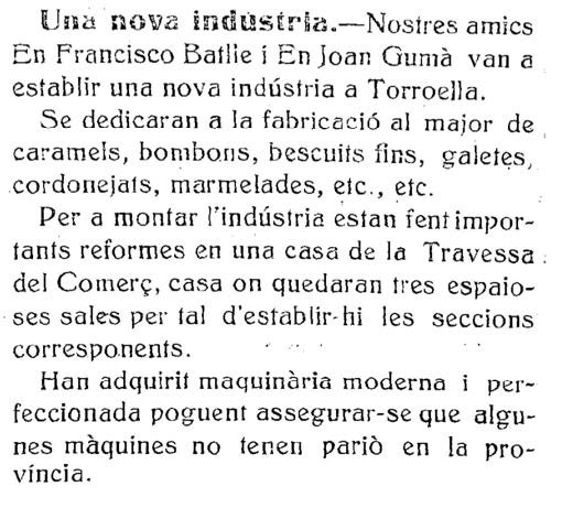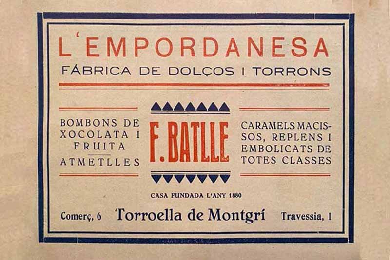 Fa justament 100 anys, concretament el dia de Nadal del 1921, es va inaugurar a la Travessa del Comerç (actual carrer d’Ullà) l’Empordanesa, una industria fundada pels amics Francisco Batlle i Joan Gumà que pretenien vendre al major caramels, bombons, bescuits fins, torrons, galetes, cordonejats, mermelades… arreu de la província. Dic pretenien perquè, malgrat la gran il·lusió, planificació i inversió que hi van posar tots dos en aquest projecte, la cosa no va acabar de rutllar. La tieta Marta Batlle, filla d’en Francisco Batlle Miquel, em diu que el gran problema va ser “que eren dos caràcters massa forts, íntims amics de tota la vida, però massa tossuts com per entendre’s en un negoci”.