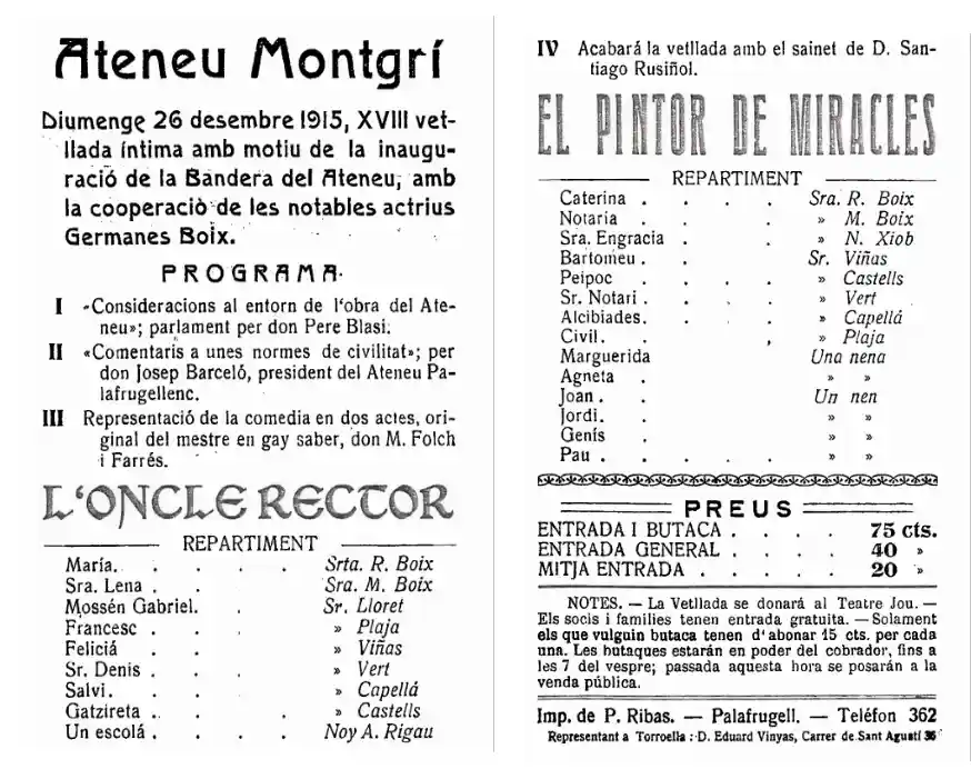 - Representació de la comèdia en dos actes, original del mestre en gay saber, Manel Folch i Torres, «L’oncle rector», a càrrec de la secció dramàtica del mateix Ateneu. On s’hi distingiren les senyoretes germanes R. Boix i M. Boix, acompanyades dels senyors Lloret, Castells, Viñas, Plaja, Capellà, Vert i Rigau.