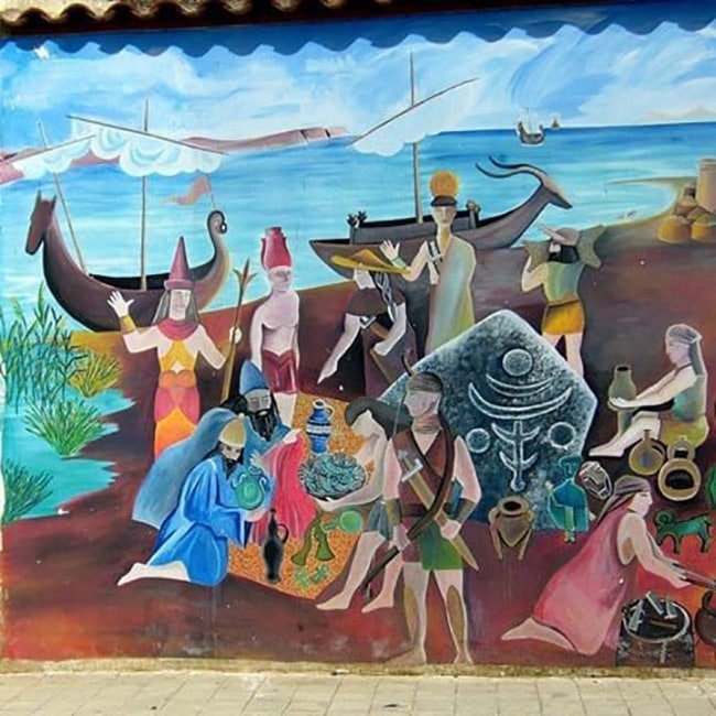 Imatge: Representació popular d’un mercat multicultural. L’escena està situada a l’Edat de Ferro, a l’oest de la regió de Sardenya, i mostra els comerciants fenicis i els illencs Nuragics que intercanvien béns materials. Mural a la plaça central de Terralba (Província d’Oristrano), Sardenya, encarregat per l’ajuntament i realitzat sota els auspicis de l’associació cultural local, SELAS. Com és habitual en els murals de Sardenya, el treball és anònim i sense data.