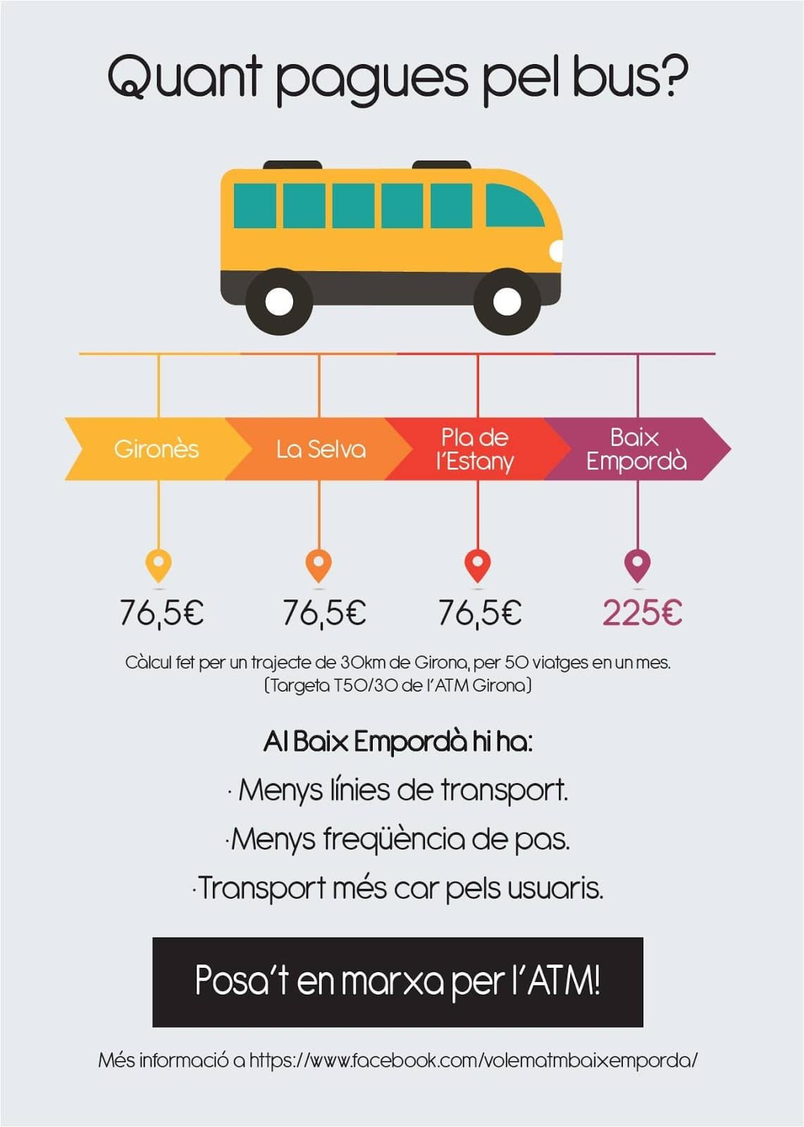 El 2016 hi va haver una molt bona iniciativa promoguda per les AMPAS dels centres educatius de Torroella i Verges per integrar el Baix Empordà a l’ATM, però no va acabar de reeixir. És per això que igual que l’ajuntament de Torroella de Montgrí i l’Estartit va liderar una campanya de millora de les carreteres del Baix Ter, juntament amb altres municipis afectats, arran d’una iniciativa ciutadana i amb els primers resultats visibles com és el giratori de “l’Empalme”, podria liderar una campanya amb altres ajuntaments afectats de l’Alt i el Baix Empordà per incorporar-nos a l’ATM de Girona i aconseguir millorar els preus i els desplaçaments en transport públic a l’interior de l’Empordà i amb Girona. És cert que la T-Mobilitat ha de servir per corregir les disfuncions del sistemes zonals tarifaris, però ser dins l’ATM ens permetria accedir de forma més ràpida a la T-Mobilitat, un nou sistema tarifari que servirà per tot Catalunya.