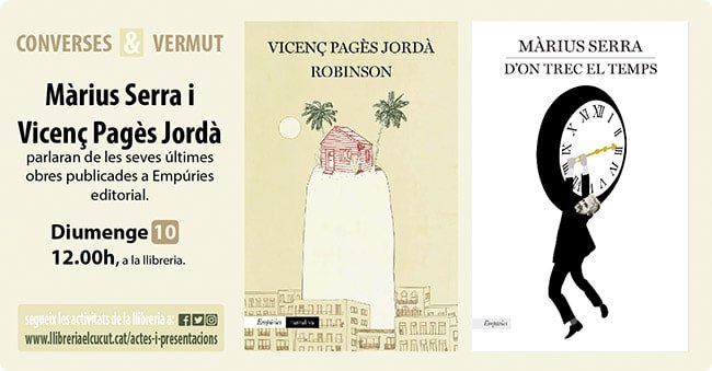 Vicenç Pagès i Màrius Serra al Cucut. El diumenge 10 al migdia els dos autors van comentar els seus llibres “Robinson” i “D’on trec el temps”, amb una conversa seductora, amenitzada amb un vermut.
