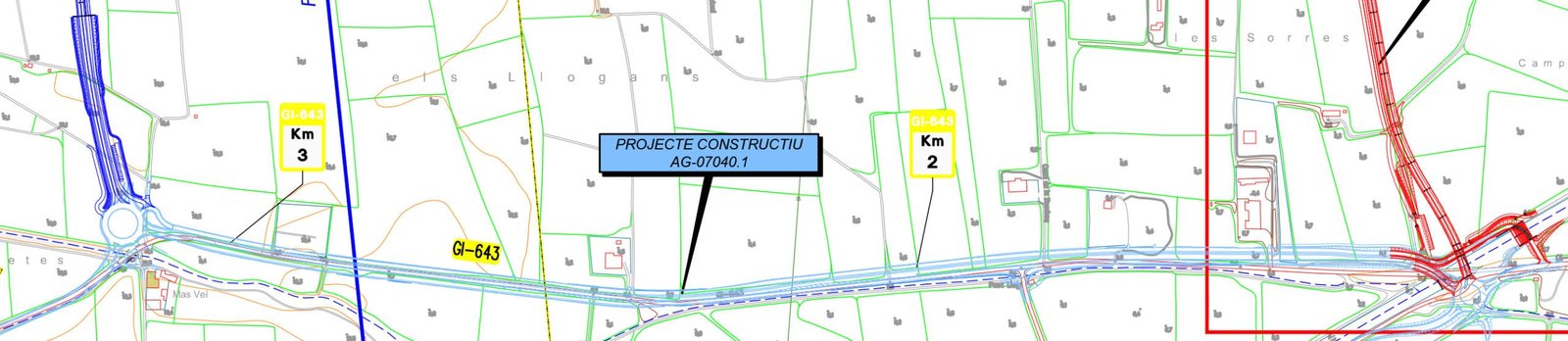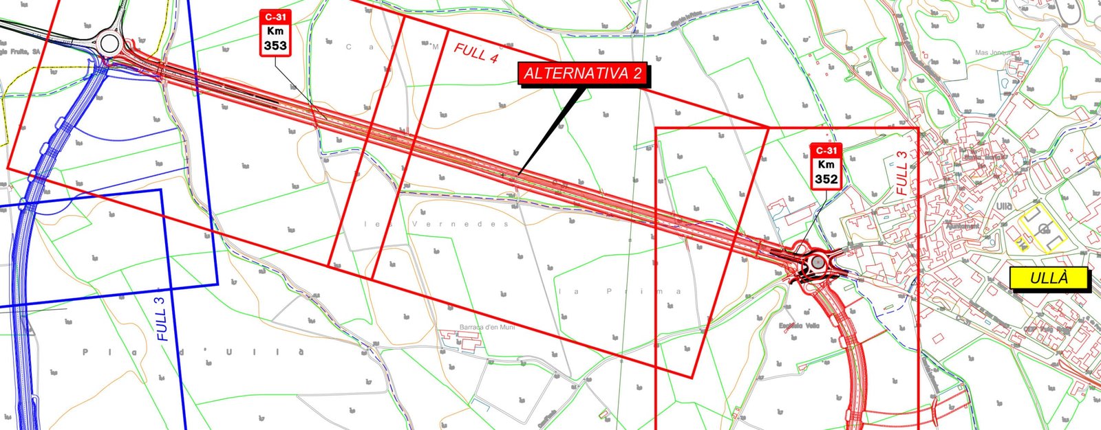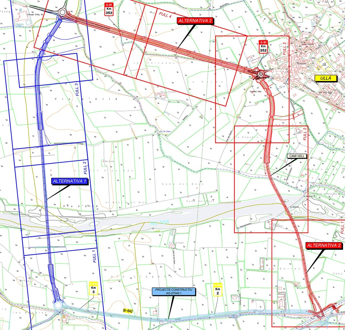 “El projecte analitza dos [sic] alternatives de traçat pel nou vial de la C-31. En ambdós casos el nou vial comença en una futura rotonda que es [sic] situarà en el PK 1 de la carretera GI-643 [Pont Verd]… De la mateixa manera, ambdós [sic] alternatives finalitzen en [sic] la rotonda existent situada a l’encreuament entre les carreteres GI-632 (PK 0+000) i la C-31 (PK 353+500) [“Empalme”]”.