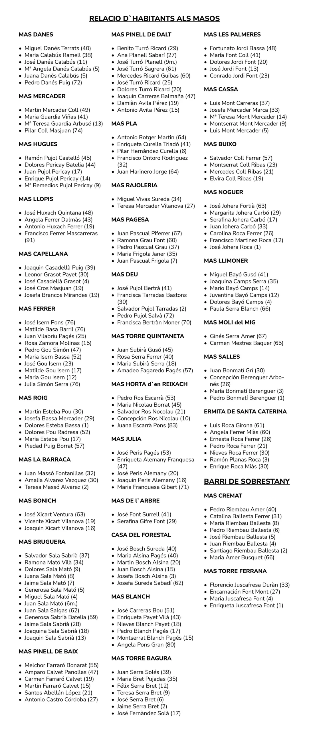 A la relació hi figuren trenta tres masos: Mas Danés, Mas Mercader, Mas Hugues, Mas Llopis, Mas Capellana, Mas Ferrer, Mas Roig, Mas Barraca, Mas Bonich, Mas Bruguera, Mas Pinell de baix, Mas Pinell de dalt, Mas Pla, Mas Rajoleria, Mas La Pagesa, Mas Déu, Mas Torre Quintaneta, Mas Horta d’en Reixach, Mas Julià, Mas de l’Arbre, Casa Forestal, Mas Blanch, Mas Torre Bagura, Mas Les Palmeres, Mas Cassà, Mas Buixó, Mas Noguer, Mas Llimoner,Molí del Mig Mas Salles, Ermita Santa Caterina. A Sobrestany: Mas Cremat i Torre Ferrana.
