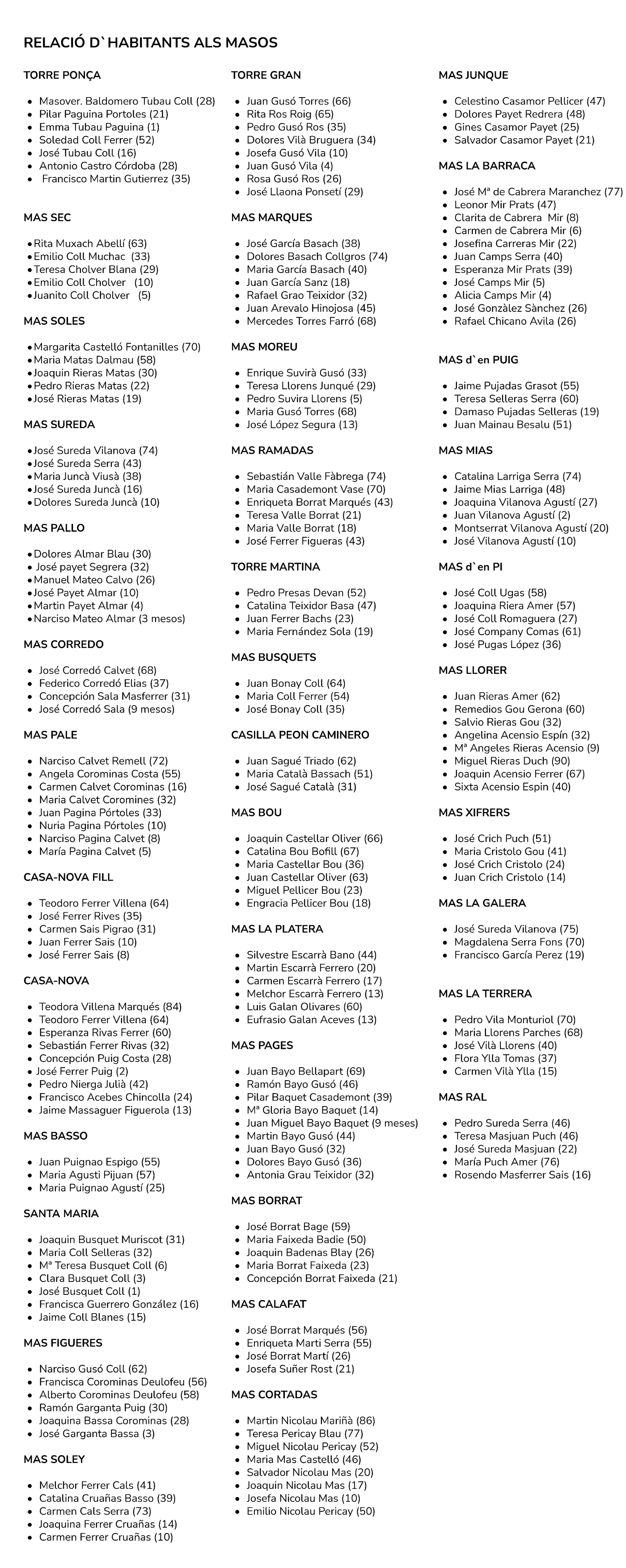 A la relació hi figuren trenta-sis Masos: Torre Ponça, Mas Sec,Mas Solés, Mas Sureda, Mas Palló, Mas Corredó, Mas Palé, Casa Nova fill, Casa Nova, Mas Bassó, Santa Maria, Mas Figueres, Mas Soley, Torre Gran, Mas Marquès, Mas Moreu, Mas Ramades, Torre Martina, Mas Busquets, Casilla de “Peones Camineros”, Mas d`en Bou, La Platera, Mas Pagès, Mas Borrat, Mas Calafat, Mas Cortades, Mas Junquer, La Barraca, Mas d’en Puig, Mas Miàs, Mas d’en Pi, Mas Llorer, Mas Xifrers, Mas La Galera, Mas La Terrera i Mas Ral.
