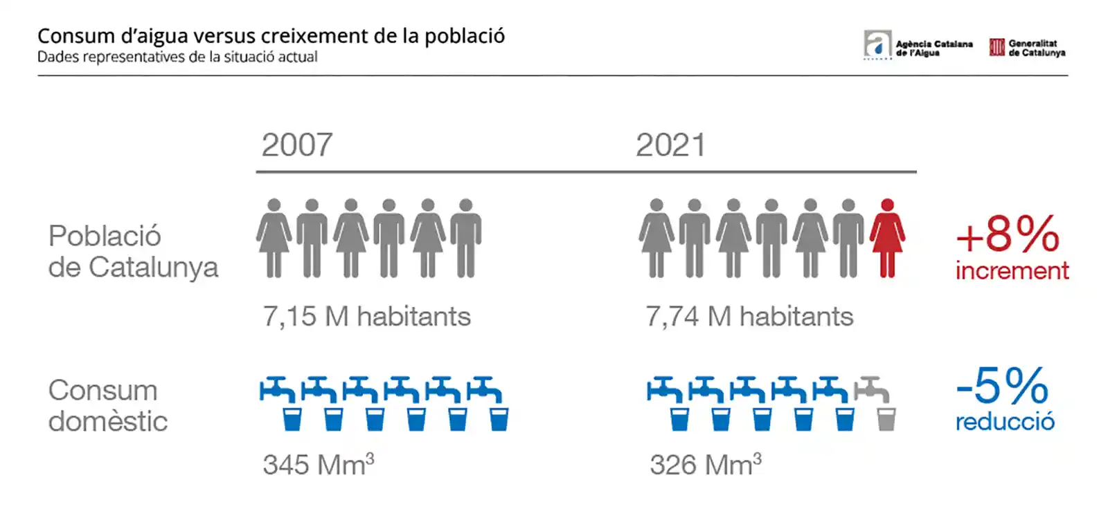 Els números de la mateixa ACA ens diuen que la totalitat de la població de Catalunya consumeix el 15% de l’aigua subministrada. El percentatge augmenta fins el 28% si només prenem en consideració les conques internes (que exclouen Ebre i Segre), pel menor volum de què disposen. En aquest capítol, a més de l’ús domèstic de l’aigua, s’hi comptabilitza, també, l’aigua usada per serveis públics, comerços, petita indústria i la major part del sector serveis, com ara el turístic. Si mirem, de més a prop, què passa a les llars catalanes, els números de l’ACA indiquen un consum per habitant i dia situat, de mitjana, en 118 litres, que baixen fins als 105 als municipis de l’àrea metropolitana de Barcelona, on viu el gruix de la població catalana. Dues dades ens poden ajudar a comprendre si tot això és molt o poc. L’accés a l’aigua és un dret fonamental reconegut per Nacions Unides des de l’any 2010, i l’Organització Mundial de la Salut estima en 100 litres per persona i dia la dotació per garantir una vida digna a tota la població. En contrast, a la ciutat de Las Vegas, al desert de Mojave, el consum per persona i dia està al voltant dels 800 litres, en línia amb altres ciutats nord-americanes. Tornant a casa nostra, juntament amb un consum baix o molt baix, registrem, a més a més, una tendència clarament positiva. Des de la sequera de 2007-2008, la població del país ha augmentat al voltant d’un 8%, mentre que el consum domèstic ha disminuït, en conjunt, un 5%, gràcies a una disminució per càpita encara superior. Aquell episodi tan traumàtic per a la població va deixar una petjada indeleble en el seus hàbits i comportaments, que van esdevenir més frugals.