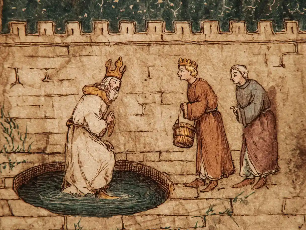 E lo rei En Jacme, qui ho oí, tenc-se per perdut e dix-li que mester era que ell n’isquès, de la cambra e del castell, enans li començàs una cava dintre en la cambra. […] E lo mestre va obrir e trencar lloses de la cambra qui era llosada e esdevenc en aquell lloc on era l’aigüera e trobà-la ampla, encara més que no es pensava. […] E vestí’s una sua gramalla de blanc de Narbona, tint en grana, folrada de pena d’anyines, e entrà en l’aigüera ab lo mestre, que anà primer ab llum de candeles en una llanterna e dos escuders qui el seguien detràs, sens pus. E abans que isquessen pres comiat de sa muller la regina e ab grans llàgrimes partiren-se abdui. […] E lo rei En Jacme, qui es viu defora, tenc-se per estort e trobà’s tot sollat, e ell e son vestit, mas no s’ho presà res, tant havia gran goig com així n’era eixit e estort.