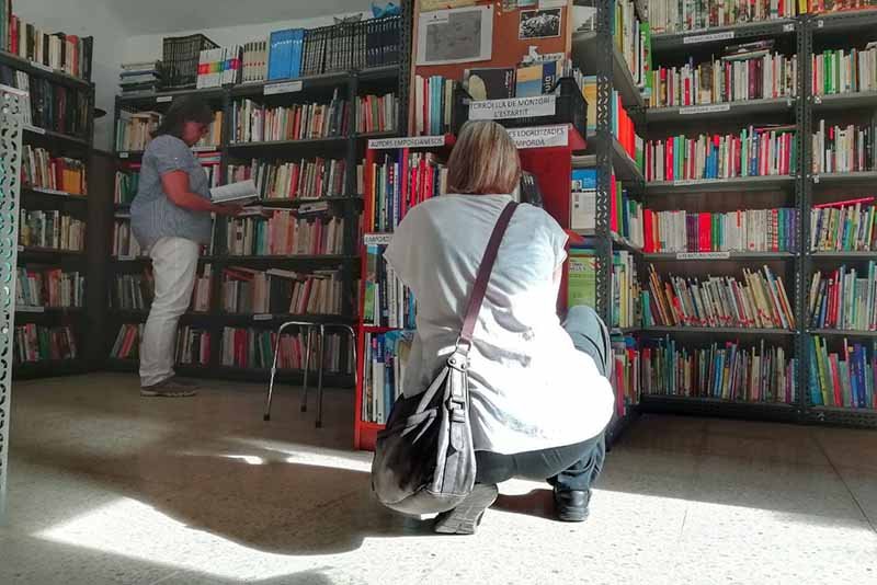Sí, el primer que vam fer abans de començar va ser contactar amb Connexió Papyrus. Des d’allà ens han guiat molt i ens han ajudat sempre. Ells ens van presentar Taberna Libraria, la llibreria solidària de Figueres, i gràcies a tots dos vam aconseguir les lleixes que tenim. Venen de la Casa de Cultura de Girona, les vam anar a buscar i les vam muntar aquí. Papyrus també ens ha assessorat sobre què recollir i què no. Per exemple, no admetem enciclopèdies, diccionaris, ni llibres de text perquè no tenen sortida.